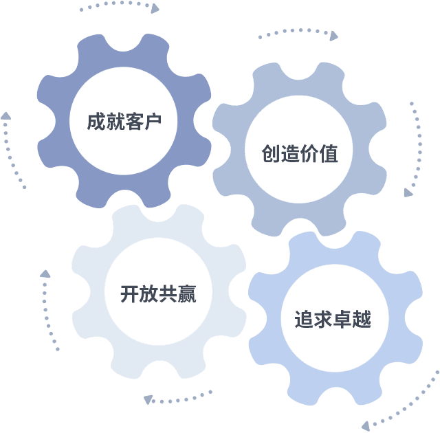 成就客户是一切决策的出发点,,创造价值是衡量所有工作的标准,,,,追求卓越是我们做事做人的态度,,开放共赢是我们的格局也是最终的结果。。。。价值观的齿轮环环相扣,,推动着组织里的每个人不断向前。。。